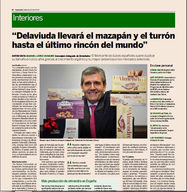 Madrid, 22 de abril de 2015. El diario económico-financiero Expansión ha publicado, en su edición del 22 de abril, una entrevista de D. Manuel López Donaire, Consejero Delegado de Delaviuda Confectionery Group. Con el titular “Delaviuda llevará el mazapán y el turrón hasta el último rincón del mundo”, el artículo presenta las principales magnitudes y características del Grupo. Para leer…